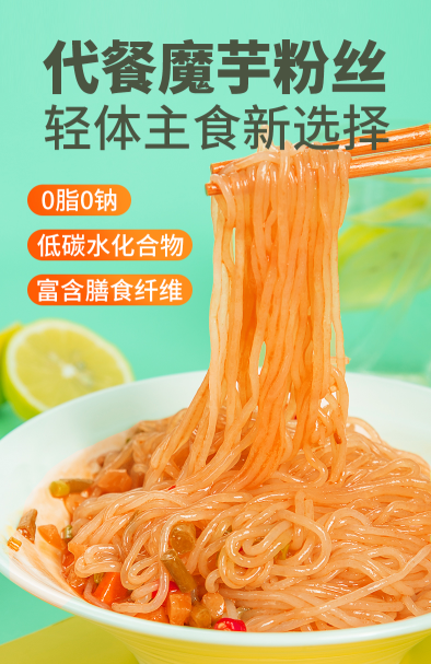 美味大膽嗦,解饞無腹擔(dān)。魔芋粉絲晶瑩透亮,含有葡甘聚糖,具有強大的膨脹力,產(chǎn)生飽腹感。
